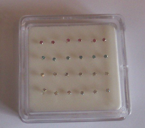 pack of 24 sterling silver clawset nose studs 4 colour jewel clear,pink.aquablue,ab 6 of each colour 10mm posts can be bent into l shape to hold nose stud in place clawset jewels so jewels will not fall out 1.8mm square cut jewels