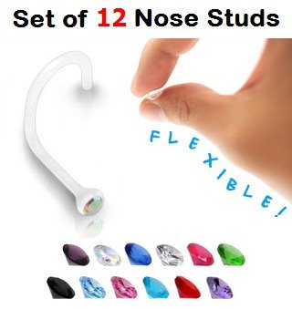 Value Pack of 12 x BioFlex Nose Studs (18 gauge) with 2mm Bezel Set Gem Stones (Purple, Aurora Borealis, Blue, Clear, Fuchsia Pink, Green, Black, Light Blue, Pink, Aqua, Red and Tanzanite) Supplied in Gift Pouch