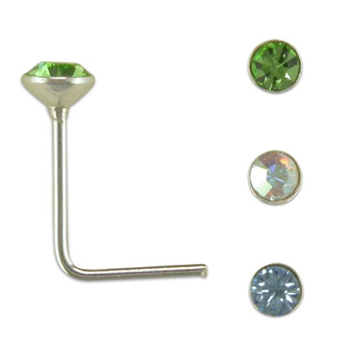 Sterling silver nose studs. Set of 3 with random colours. The crystals are 3mm in diameter. These nose studs are L shaped for an easy fit and will come to you in a small clear-top box.
