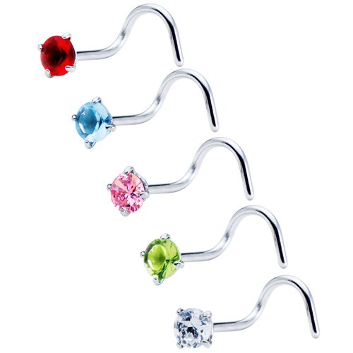 Dazzling gem nose scew ring crafted from quality 316L Surgical Grade Stainless Steel. This five-pack of nose rings includes a red, light blue, pink, peridot green and clear crystal nose screw ring. Sparkling cubic zirconia nose ring bonus pack.. Specifications: 20 Gauge (.8mm), 1/4" (6mm), 316L Surgical Grade Stainless Steel, Five Nose Screw Rings, Prong-Set Cubic Zirconia. 20 Gauge Stainless Steel CZ Nose Ring Pack