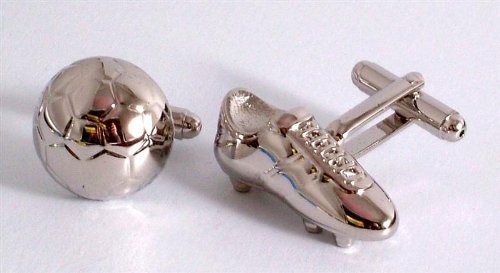 Attractive gentleman's cufflinks in a white coloured metal. Football boot and ball design. Come in their own presentation box. Football boot measures approximately 28 mms in length and the ball measures approximately 17 mms. Other design available - golf ball and tee - Cricket bat and ball.