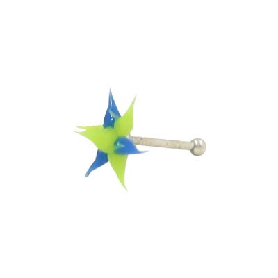 This is a bright nose stud with a silicone yellow and blue star shape spike design made with a .925 sterling silver shaft. The design size is 3.5mm.This nose piercing body jewelry is designed to universally fit anyone. It is available in your choice of 18 or 20 gauge. The entire piece is nickel free.
