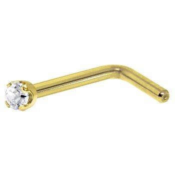 Genuine cubic zirconia L-shaped nose ring. Artisan handmade 18 gauge 14kt yellow gold nose ring with a 2mm prong set cubic zirconia. Made in USA factory direct. Gold body jewelry. Specifications: 18 Gauge (1mm), 1/4" (6mm), Solid 14kt Gold, 2mm Cubic Zirconia, Prong-set, Handmade in USA, Hand polished