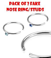 Value Pack of 2 x Fake Nose Rings with 2mm Gems (Aqua and Dark Blue) Silver 316L Stainless Steel - Size: 1cm (10mm) Width: 20 Gauge (0.8mm) Supplied in Gift Bag (No Piercing Required)