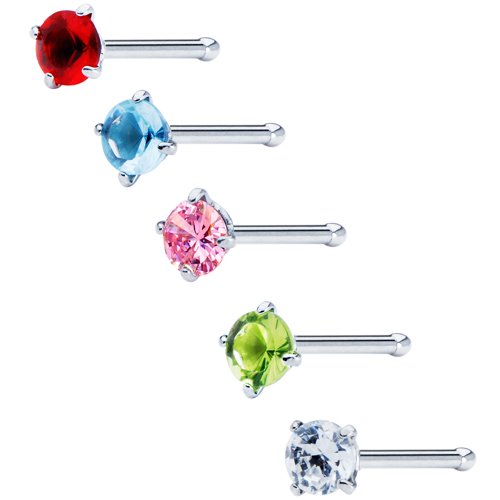 Dazzling gem nose bone ring crafted from quality 316L Surgical Grade Stainless Steel. This five-pack of nose rings includes a red, light blue, pink, peridot green and clear crystal nose screw ring. Sparkling cubic zirconia nose ring bonus pack.. Specifications: 20 Gauge (.8mm), 1/4" (6mm), 316L Surgical Grade Stainless Steel, Five Nose Bone Rings, Prong-Set Cubic Zirconia. 20 Gauge Stainless Steel CZ Nose Bone Pack